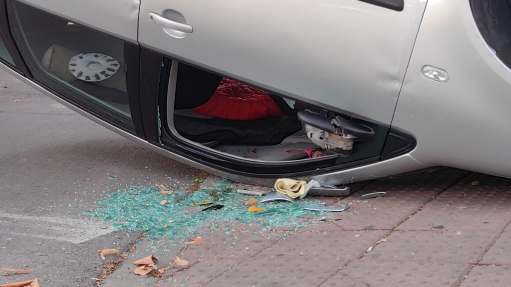 Жената от автомобила вижда в последния момент камион пред себе си, който е в нейната лента и полива цветята в разделителната тревна ивица. В уплахата си, тя предприема маневра за избягване на фронтален сблъсък, но в този си опит сече пътя на тролея. Следва стълкновения между тях, при което автомобилът се преобръща по таван и се понася към тротоара.