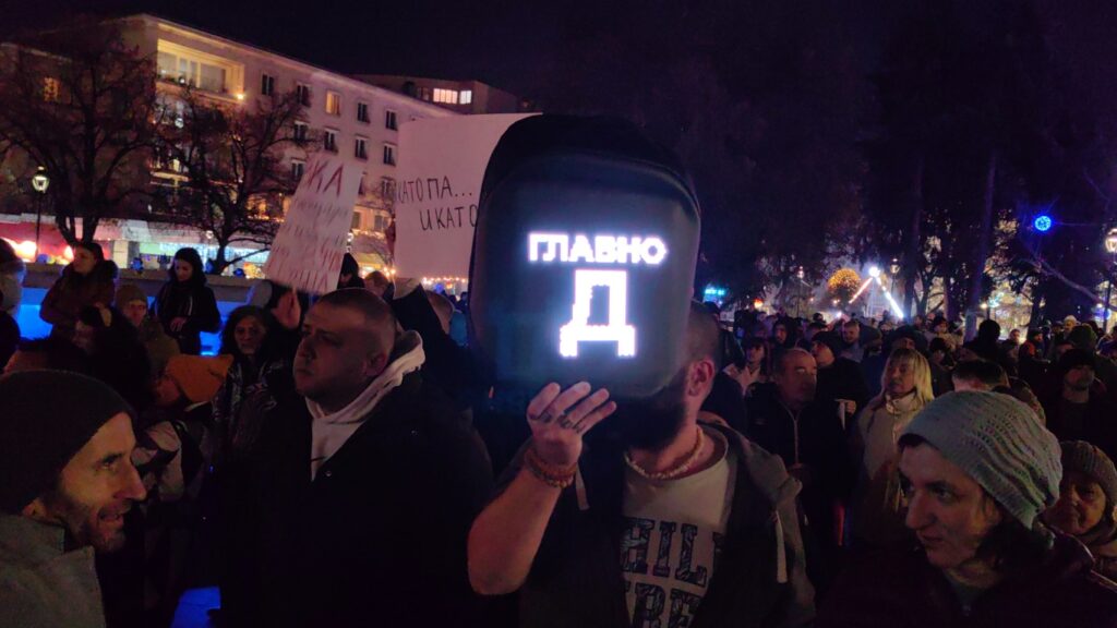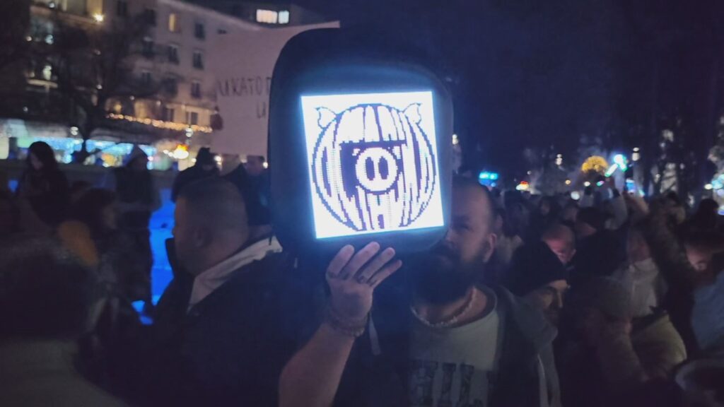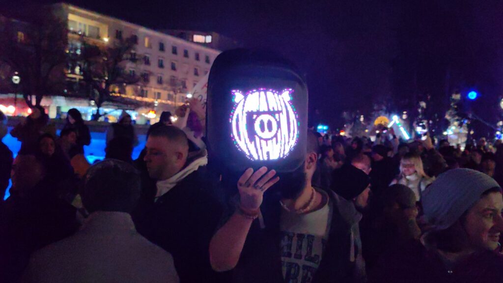Успяхме да разберем, че това е раница с LED дисплей. Закупена е била още преди няколко години и днес е превърната в светещ плакат. Недостатък е сравнително малкия размер на екрана, но затова пък е динамичен. Може да изобразява снимки, надписи и кратки GIF анимации. Захранва се с Power Bank и може да работи до 6 часа. По този начин не е необходимо някой журналист да ви освети, за да се види какъв плакат държите в ръцете и какви послания отправяте в тъмното. На дневна светлина нещата не са толкова ефективни, но определено в тъмното се откроявате в тълпата.