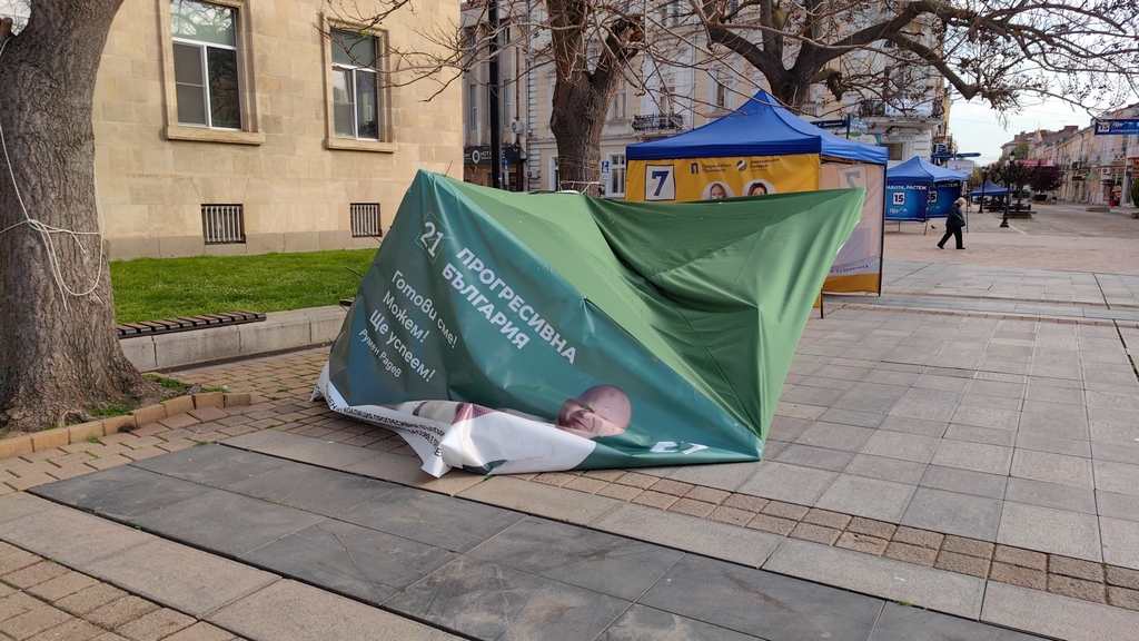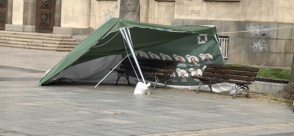 Шатрата на „Прогресивна България“, която се намира на площада в Русе, осъмна потрошена и с прерязани въжета.