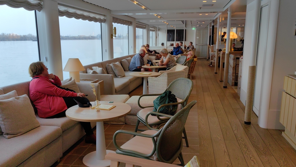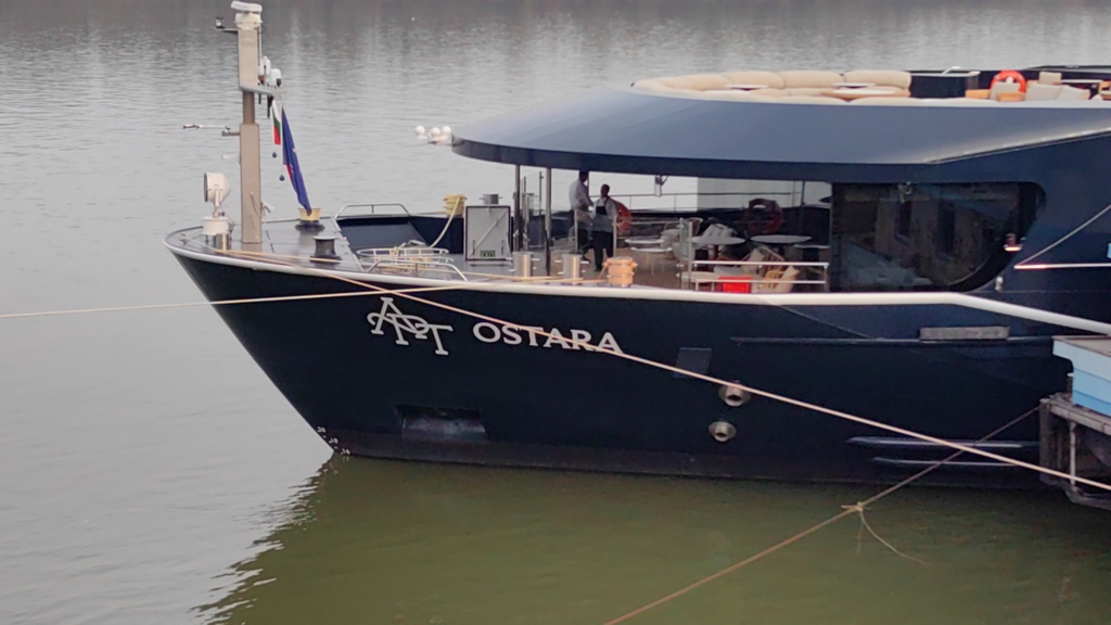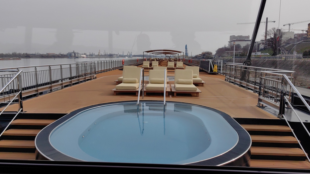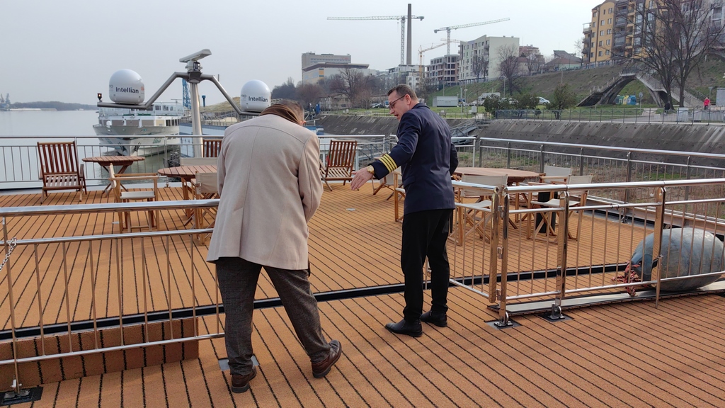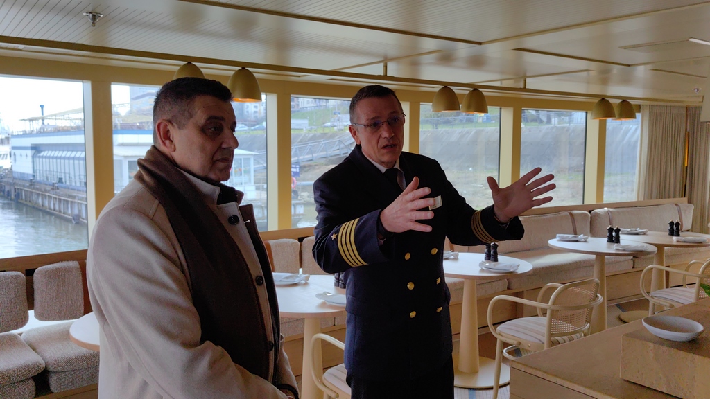 В дъното на палубата има ресторант с механизъм, който може да го издига на повърхността или да го смъква обратно в корпуса на кораба. Нещо като ресторант – асансьор. Корабът е австралийски и плава под Швейцарски флаг. Така ни обясни мениджъра на кораба. За дизайна също е била ангажирана австралийска компания. Войната в близкия изток е попречила на част от пасажерите да пристигнат и да се качат на първия круиз по долен Дунав. Наложило се е компанията да ги пренасочи към други дестинации в Китай. Не са успели да пристигнат и пасажерите от USA.
