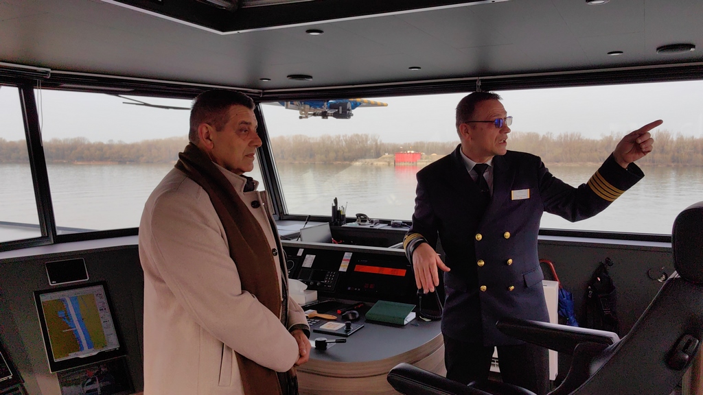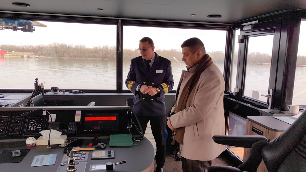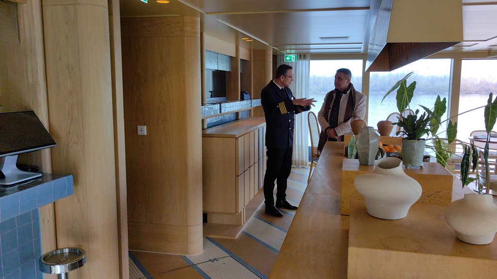 Не само ресторантът е с подвижен механизъм. Оказва се, че и капитанският мостик също има такава възможност. Тя е необходима, при плаването по каналите в Нидерландия, ни обяснява капитанът на кораба, който ни развежда и е унгарец. На капитанския мостик се срещаме и с помощник – капитана, който е българин и е от родом от Варна.