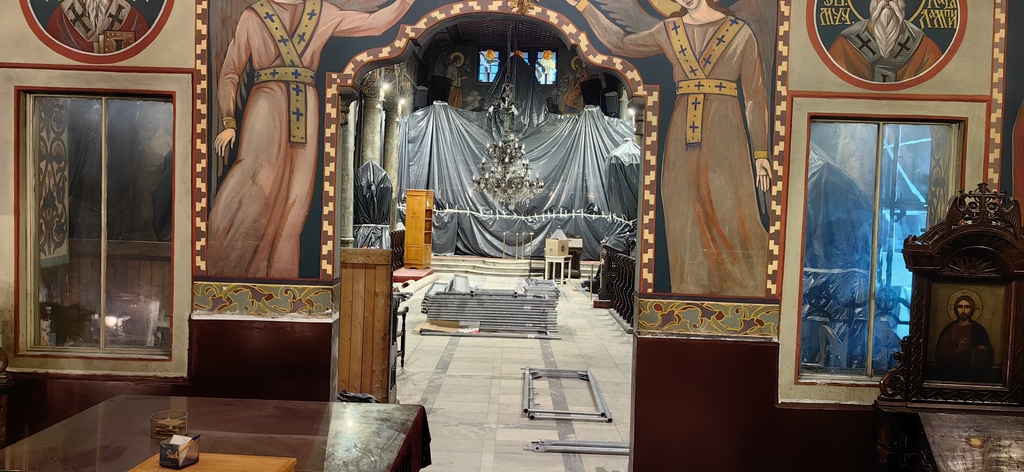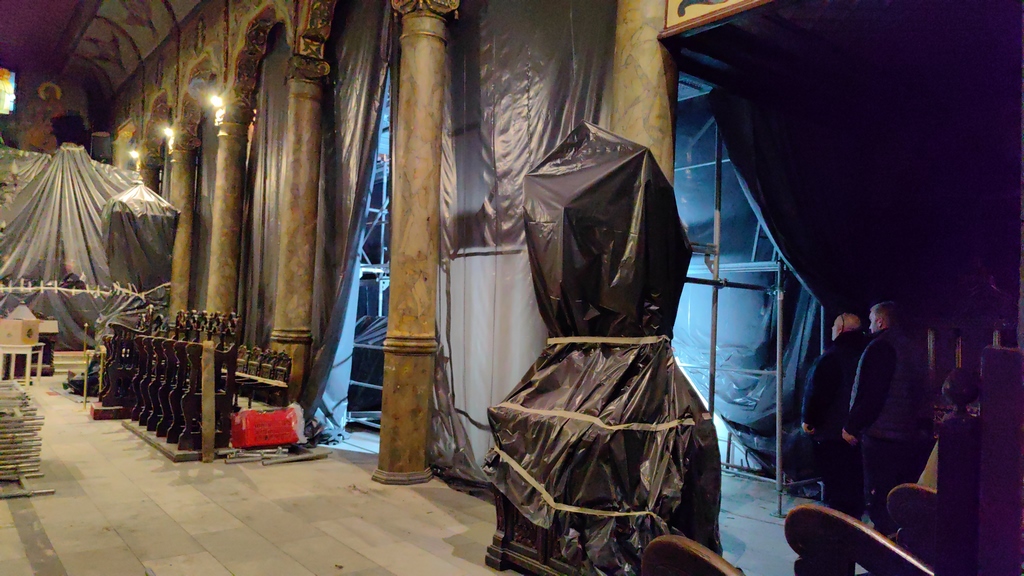 Това научи Русе Портал и в проверка на място показваме и причината за това решение. От няколко дни достъпът за граждани е забранен в катедралния храм, тъй като в момента е превърнат в строителна площадка. Изграждат се скелета и започва ремонт на покрива. Доколкото ни обясниха, това е следващия логичен етап от мащабния ремонт, започнал още през миналата година. Бяха премахнати керемидите и бе изграден изцяло нов покрив с вертикалната и хоризонталната отводнителни системи.