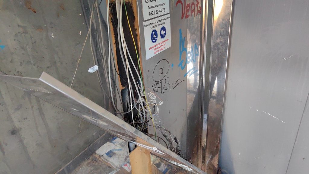Два от асансьорите на кръговото са с разбити врати. Вътре в кабинките са изкъртени панелите, извадени са копчетата, изтръгнат е плафона….Висят кабели и жици.