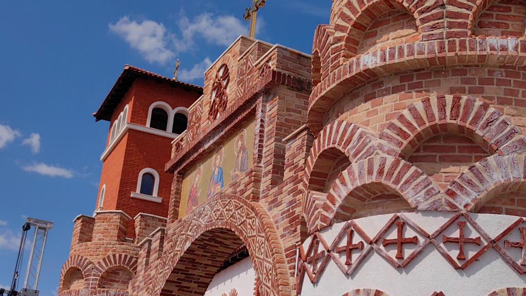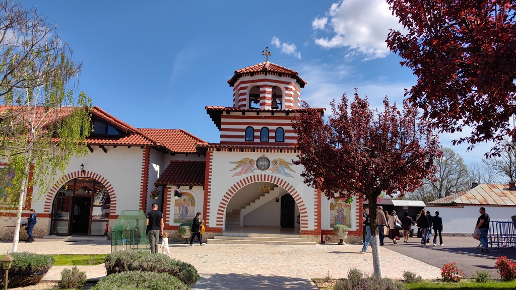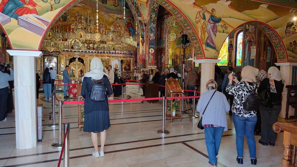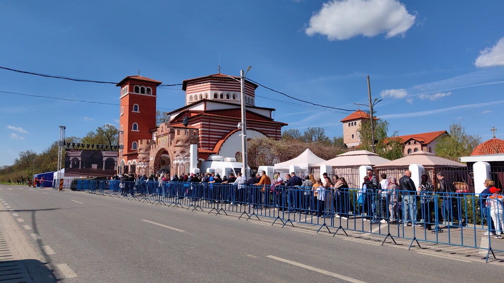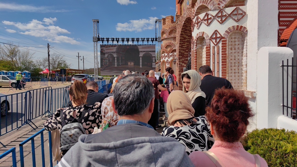 Пътят отнема около час. Стюарди на безплатния паркинг насочват къде са свободните места и съдействат по всякакъв начин. Опашката започва още отвън. Пространството се оглася от църковна служба на румънски език. Придвижването става на групи от хора, които се допускат във вътрешността на храма.